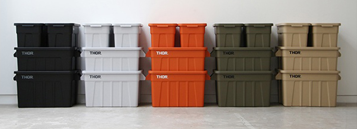 THORは、アメリカの業務用プラスチックメーカー「TRUST社」が展開するオリジナルブランド。創業以来、米国大手清掃会社向けに耐久性と頑丈さを備えた製品ラインを開発してきました。現在は家庭用としても人気が高く、屋内外で使える軽量かつ強靭なコンテナボックスを中心に幅広い収納アイテムを展開しています。