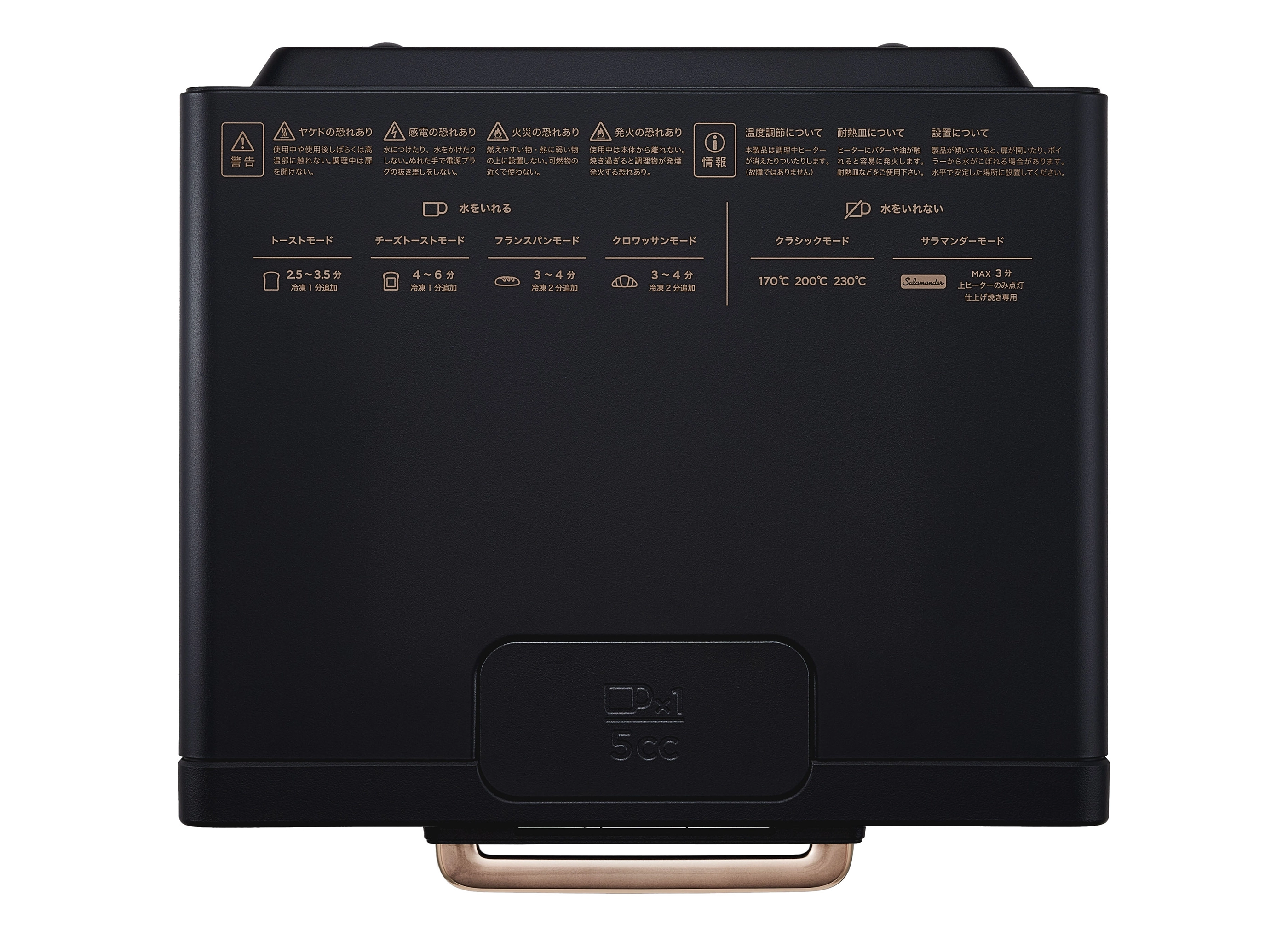 【運転モード】1. トーストモード / 2. チーズトーストモード / 3. フランスパンモード / 4. クロワッサンモード / 5. クラシックモード(170、200、230°C)/ 6. サラマンダーモード
