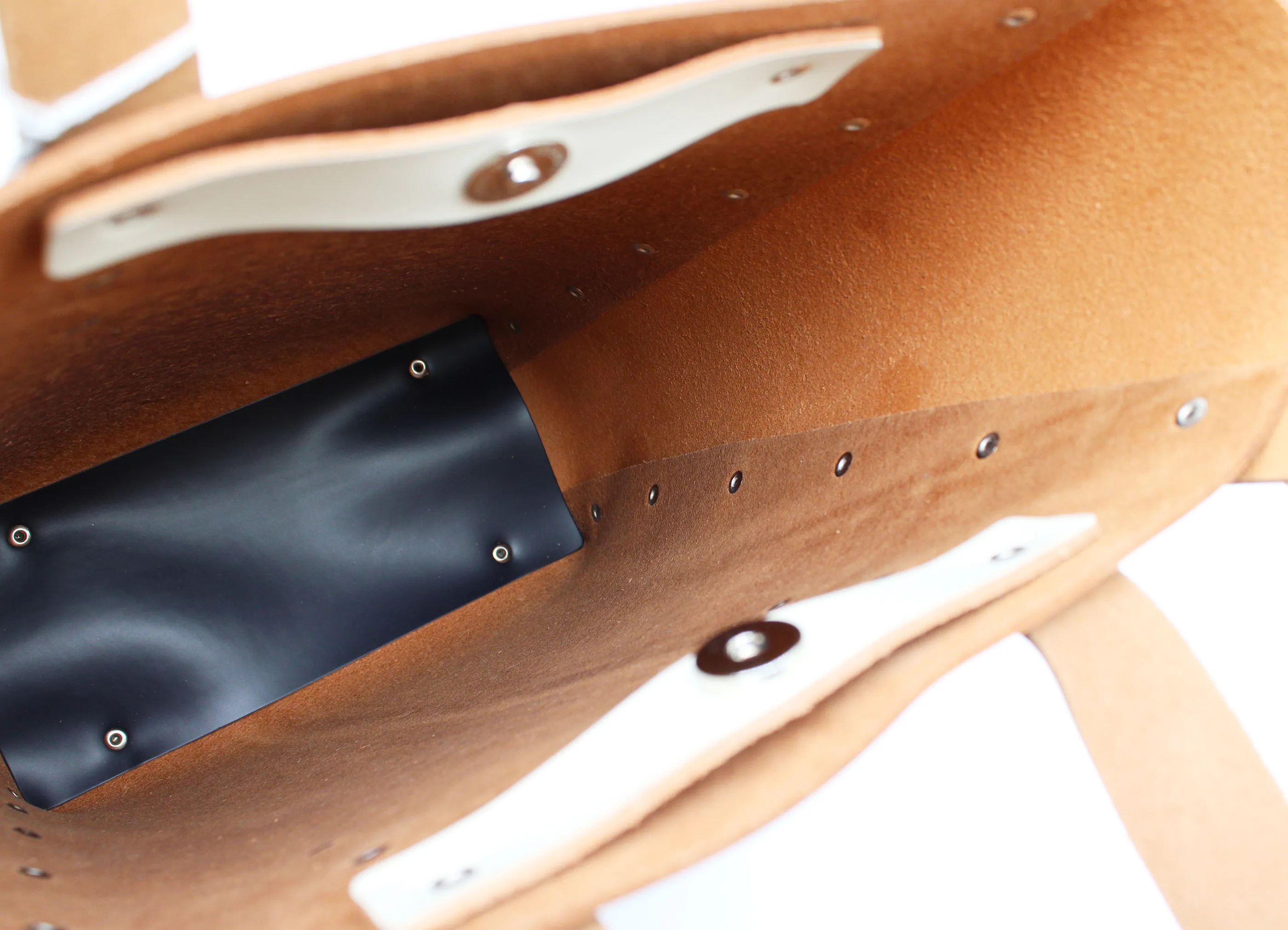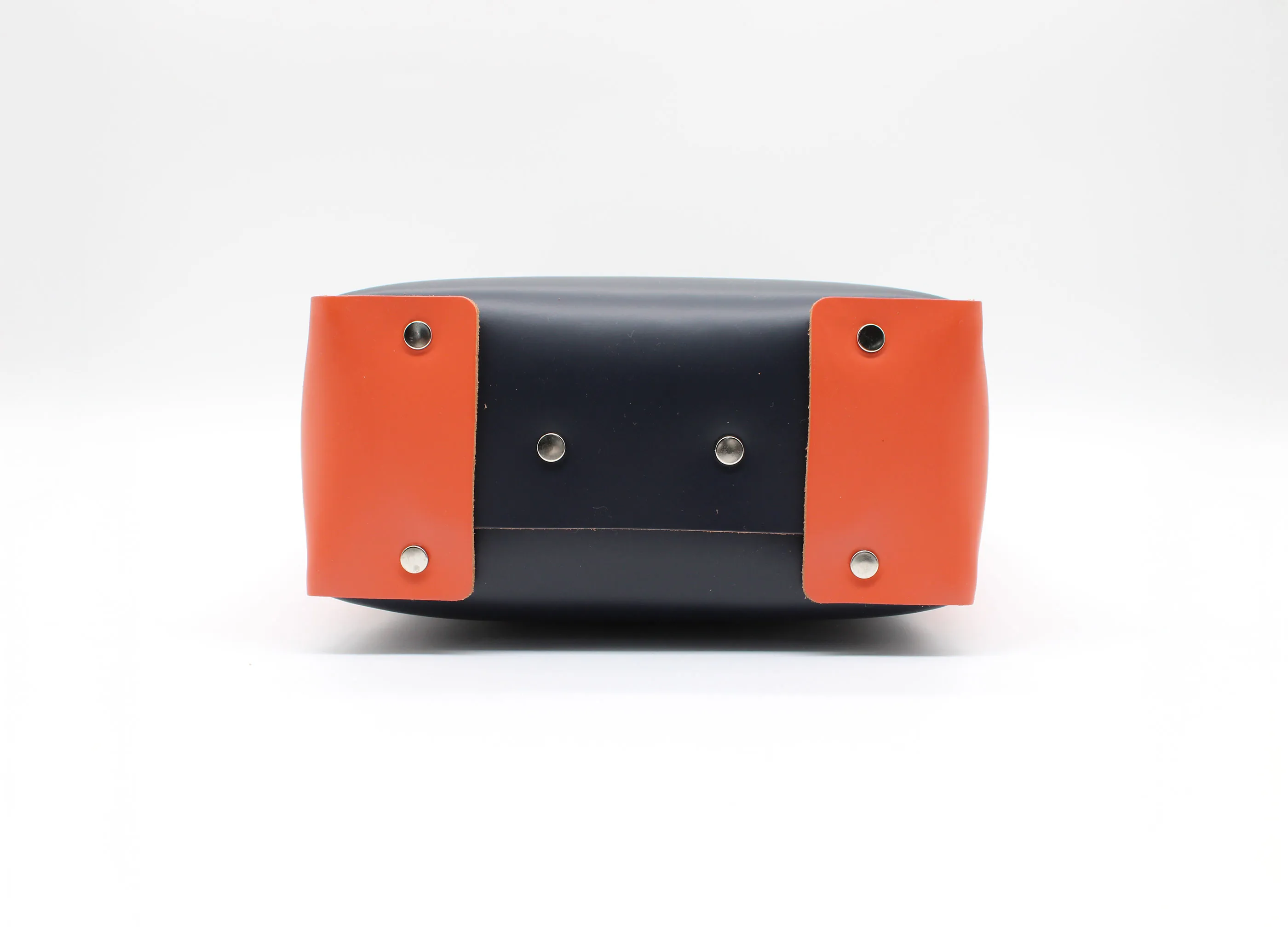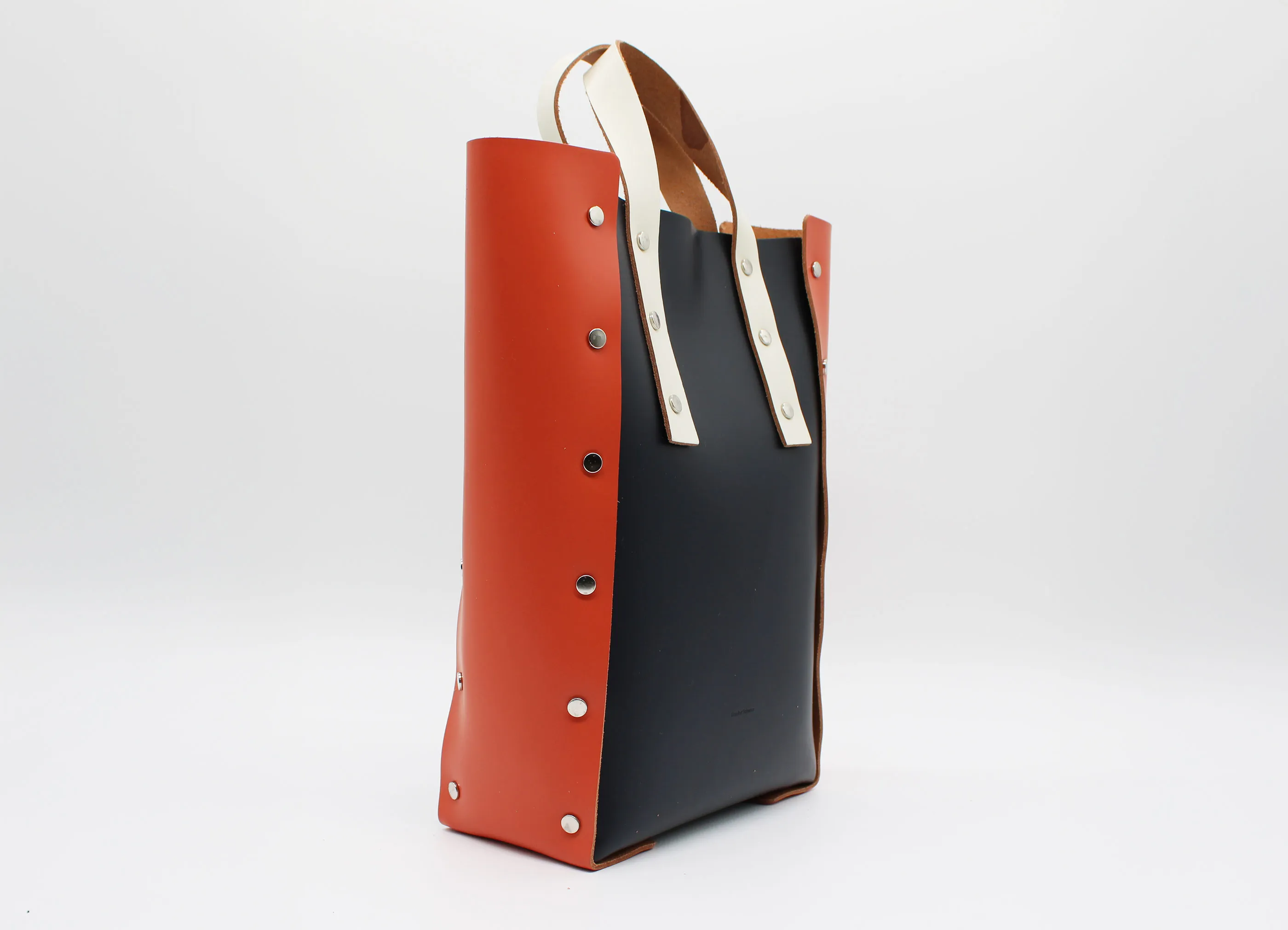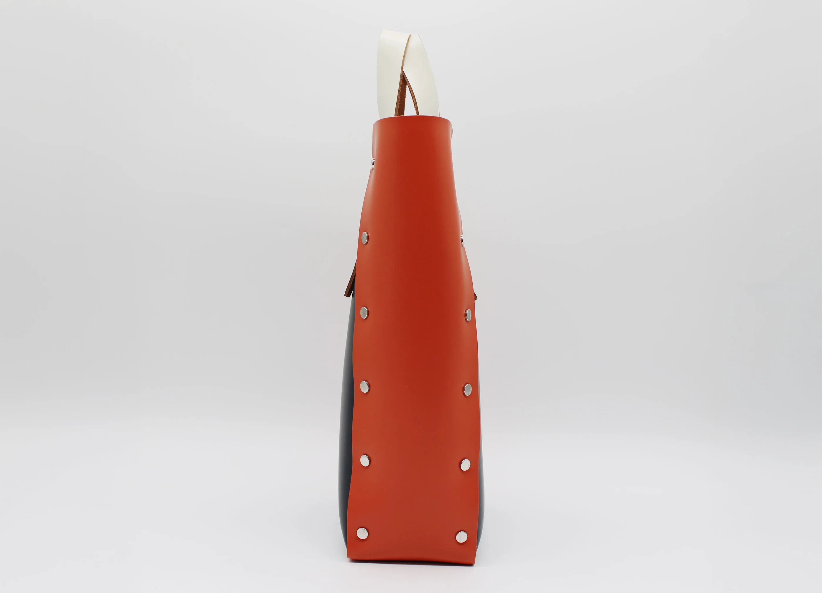 見た目にも印象的なデザインは裁断したレザーをステッチを用いずにリベットで留めてくみ上げたデザイン。素材にはしっかりとしたカウレザーに顔料コーティングをすることで艶やか高級感のある表情に。縦長の形で、普段使いにもちょうど良いサイズ感。収納口はマグネットボタンで開閉ができる仕様になっています。