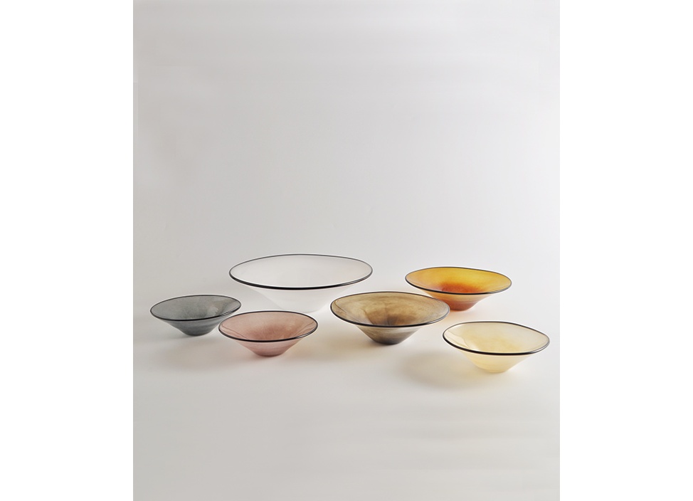 一つ一つ吹き落とされたように、その輪郭や濃淡が異なり、ふと手に取った瞬間、差し込む光の角度によってその表情が楽しめるうつわです。