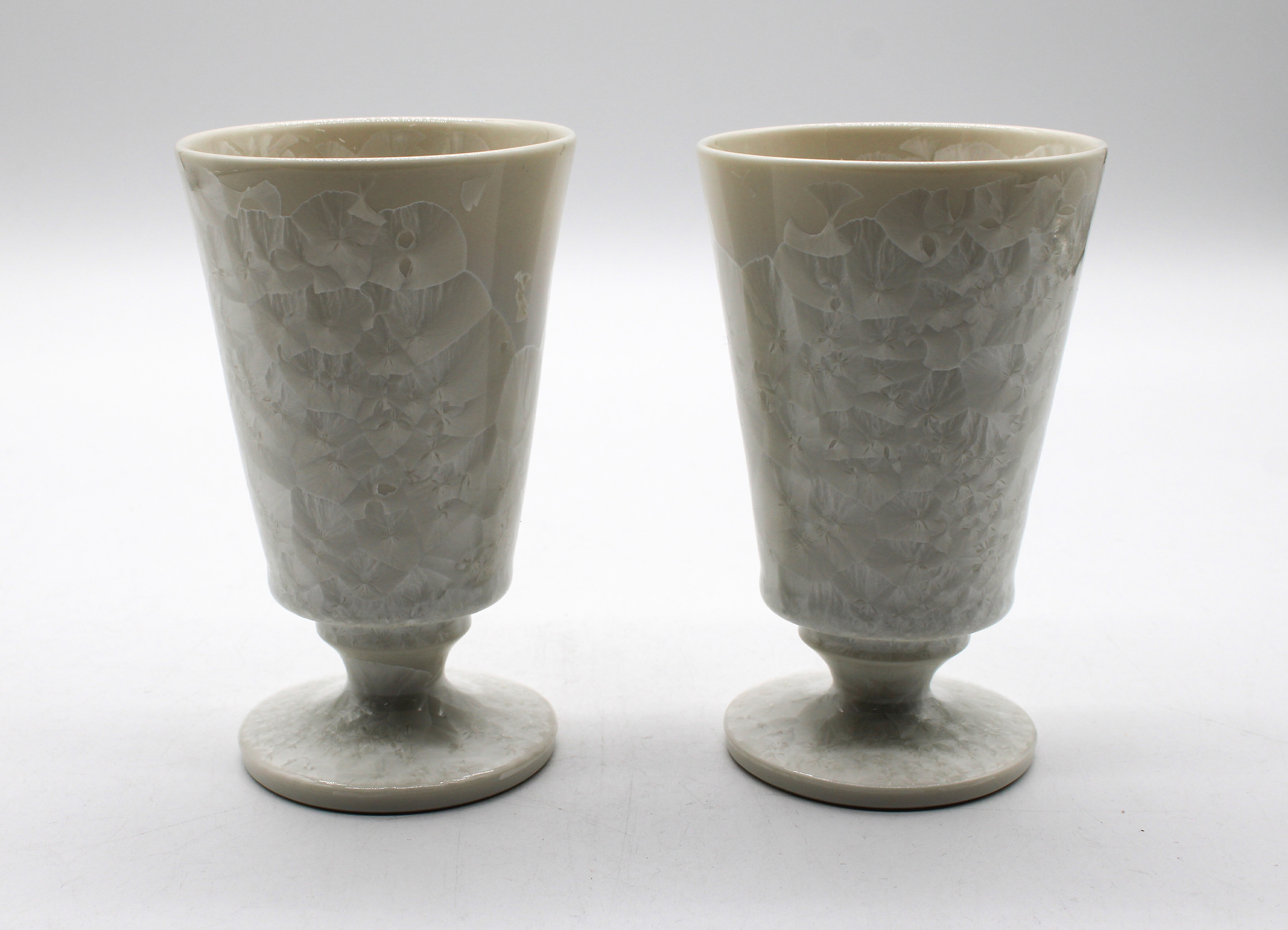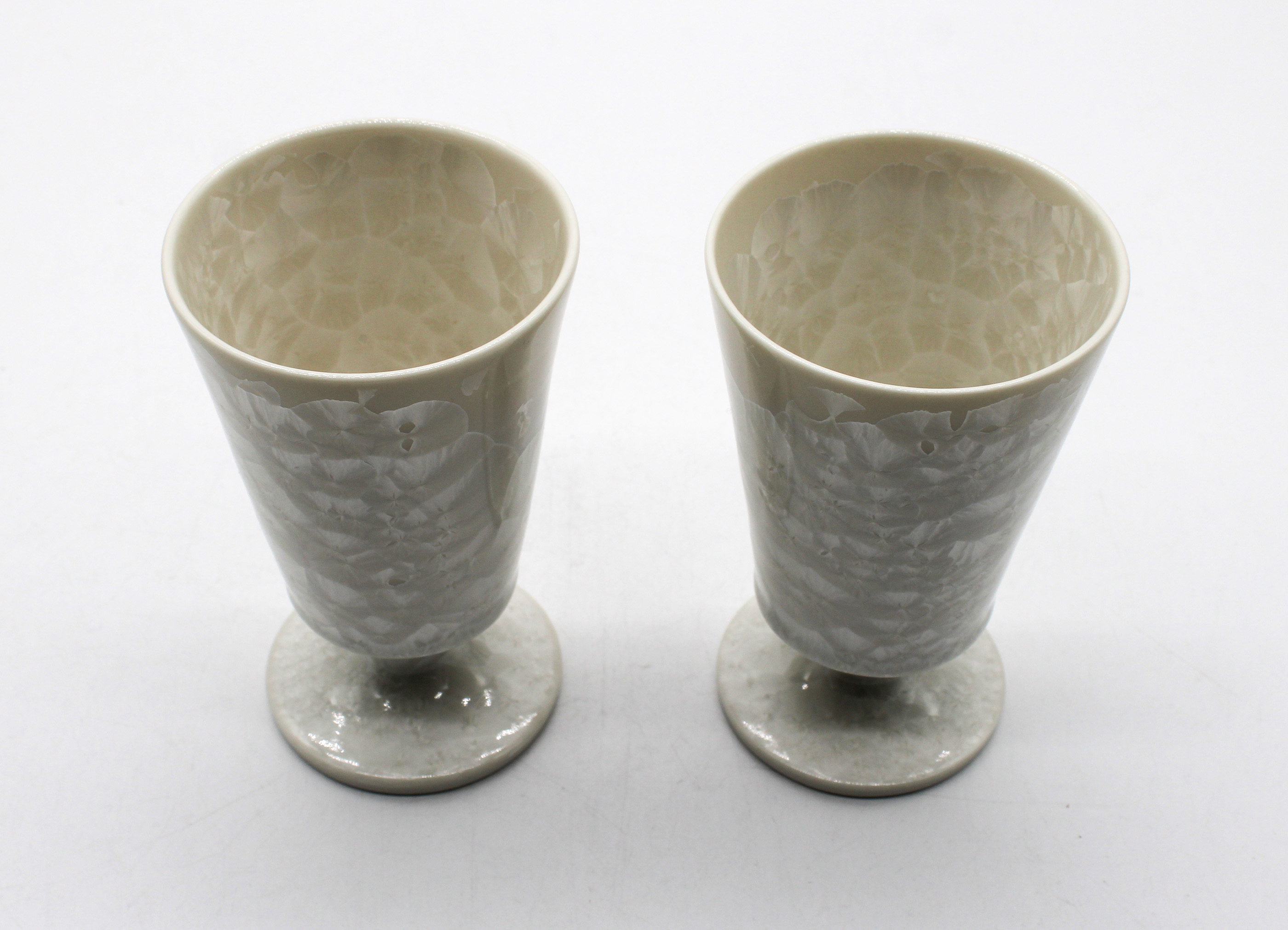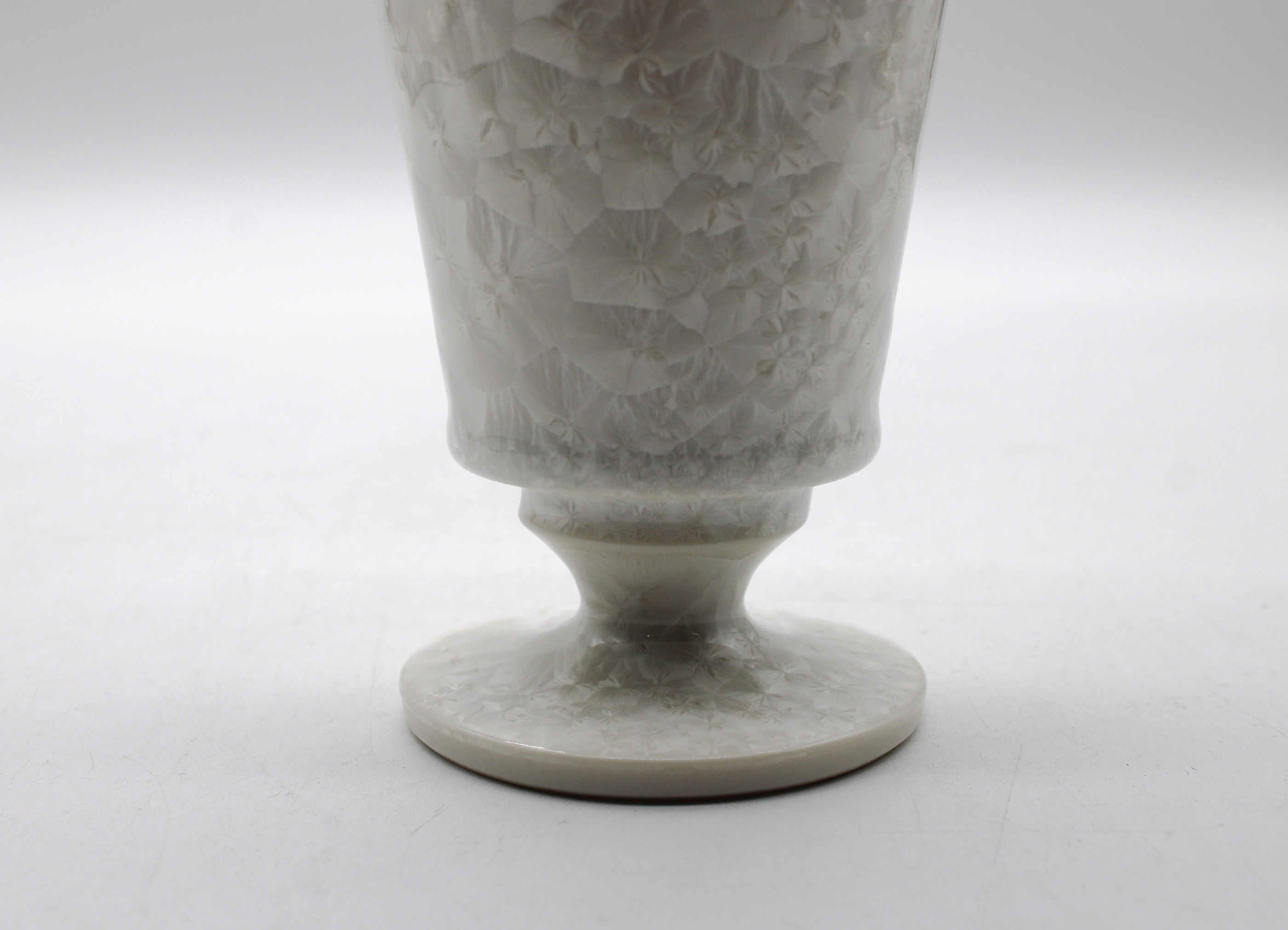 作家・板橋亨氏が長年向き合ってきたのは、窯の中で起きる目に見えない炎の動きや温度変化という自然現象です。白磁の表面に咲く「結晶釉」は、過酷な熱のなかで偶然と必然が交差して生まれる美しき副産物。雪国で暮らし、身近な風景の中で培われた本能的な美意識が、移ろいゆく結晶の現象を確かな造形へと昇華させています。一点ごとに異なる表情を持つその佇まいは、まるで銀世界の中で春の光を待つ心象風景のよう。凛とした白の質感が空間を清らかに律し、日常のなかに静謐な余白をもたらします。