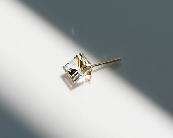 シンプルでシックなカットのクォーツに、スクエアプレートをセッティング。石内部の屈折や反射が織りなすグラフィカルな表情が魅力的なピアスに仕上がりました。アシンメトリーなセッティングで、平面と立体のコントラストが際立つ美しいピアスです。
